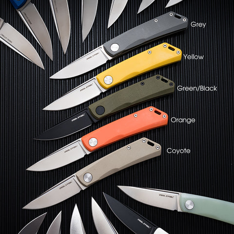 The budget-friendly version of the original was to be called Luna LITE and would comprise of only G10 handle models with D2 tool steel. The Luna LITE was to comprise several custom models picked by Real Steel dealers. The G10 colors we had ranged from red, blue to pink, GITD, and purple. Every color in between made an appearance. By far the stand-out piece was Knife Centers white G10 black blade model named Luna LITE Imperial by ourselves. At the time it seems as every Real Steel dealer had their very own individual Luna LITE, Boker had green G10 with a black blade, Heinnie Haynes had red G10 with a satin blade, White Mountain Knives had jade G10 with the satin blade.