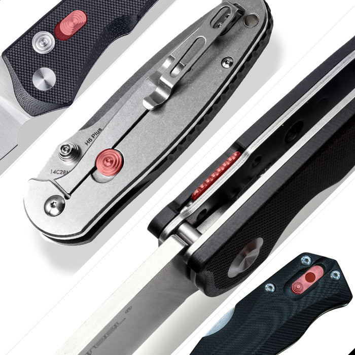 While G10 composite is commonly used for handle scales, its application as a functional spring component is innovative. Key advantages include: Aesthetic Integration: Colors seamlessly match the handles. Reduced Weight: Enhances portability without compromising durability. Technical ingenuity ensures reliability: A steel insert at the blade contact point mimics the longevity of traditional steel springs. Rigorous stress and endurance testing guarantees performance, featured in our LUX series.